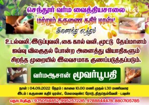 செந்தூர் வர்ம வைத்தியசாலை மற்றும் கருணை கதிர் டிரஸ்ட் இணைந்து நடத்தும் இலவச வர்ம வைத்திய முகாம்